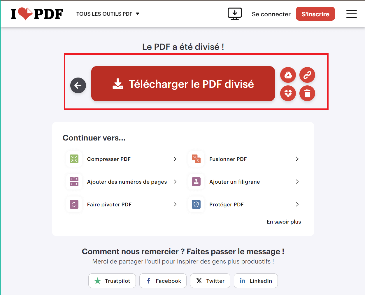 Une fois le processus de division du PDF terminé avec iLovePDF, vous pouvez télécharger le fichier ou l'enregistrer sur votre cloud.