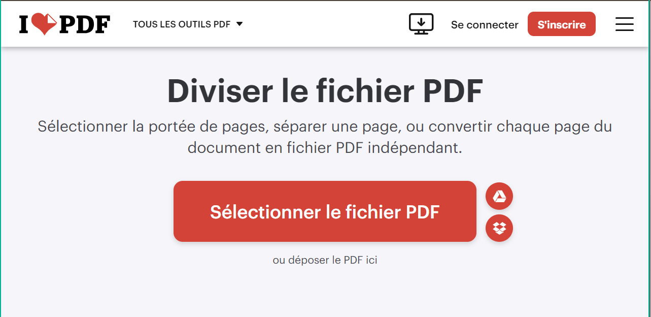 Accédez à la page d'accueil de iLovePDF et naviguez sur le site. Vous y verrez l'option "Diviser PDF". Vous pouvez diviser un PDF avec iLovePDF gratuitement.