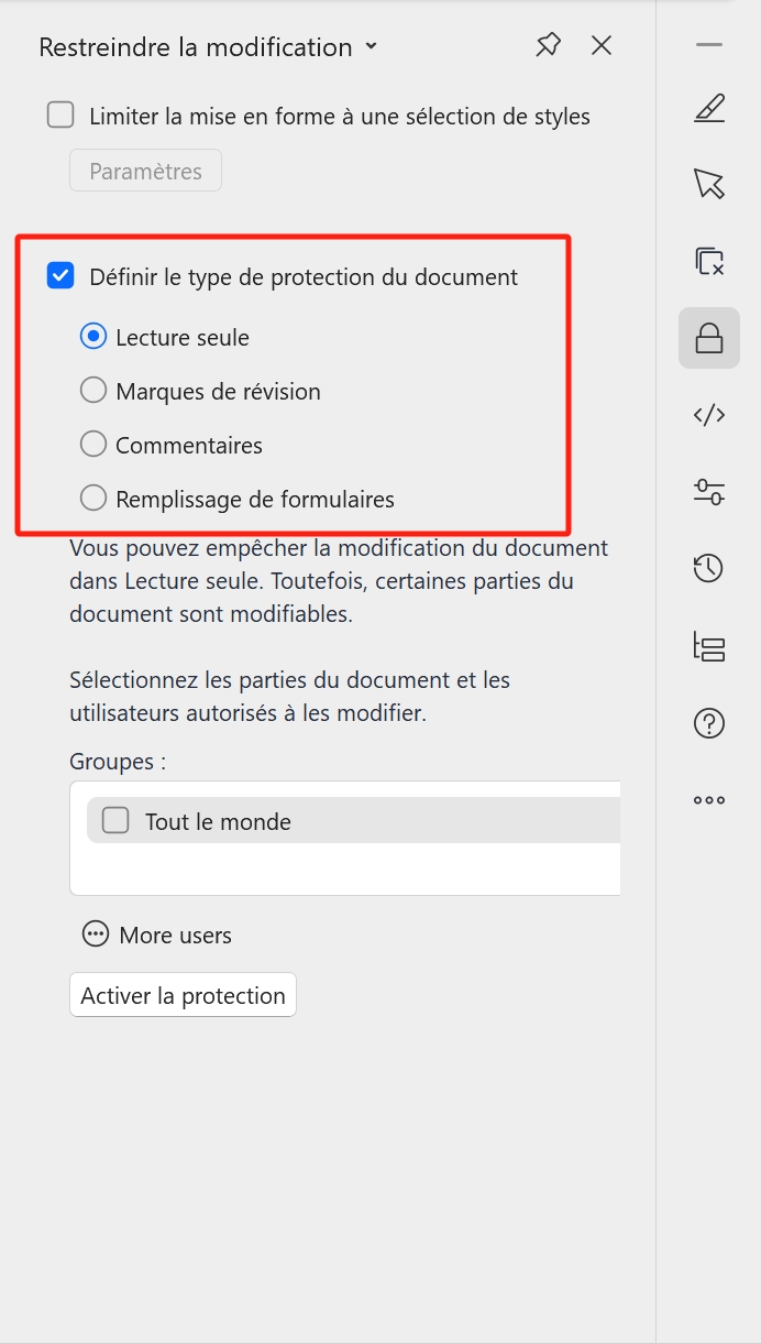 Définir la protection : cette option offre des moyens supplémentaires pour protéger votre document contre les modifications inutiles. Vous pouvez choisir de :