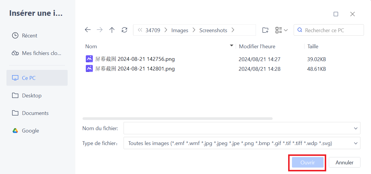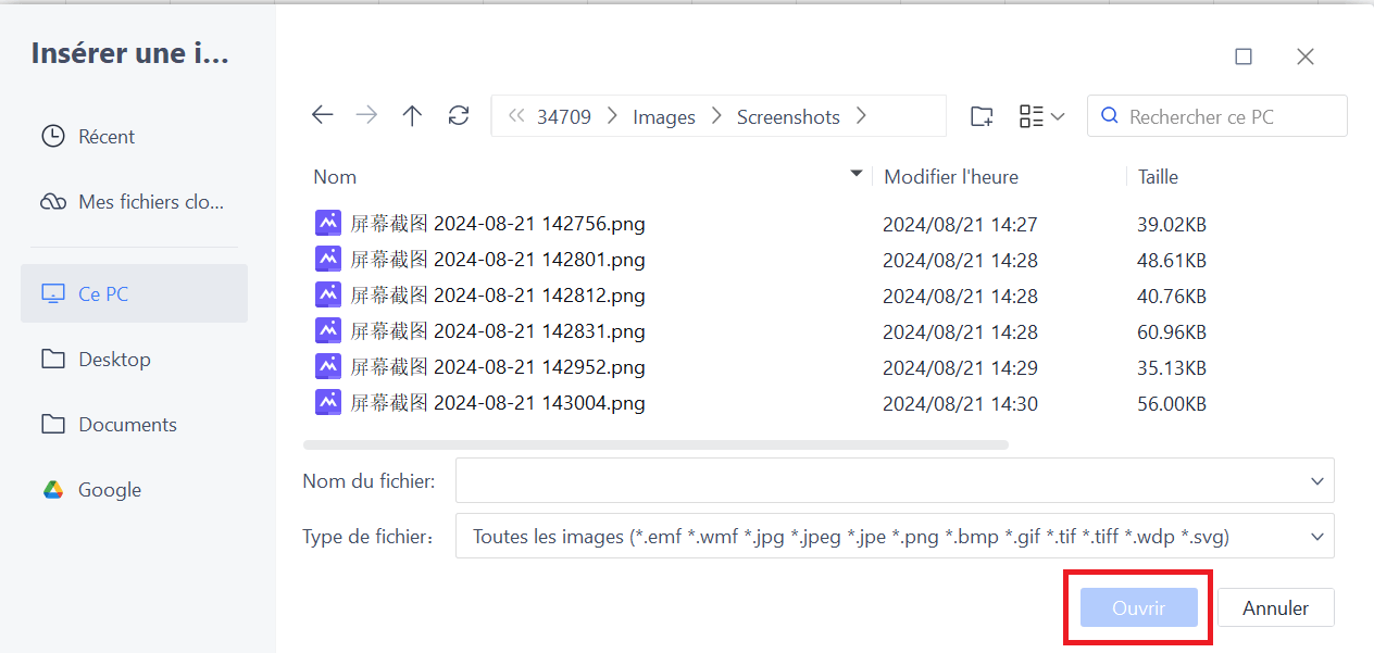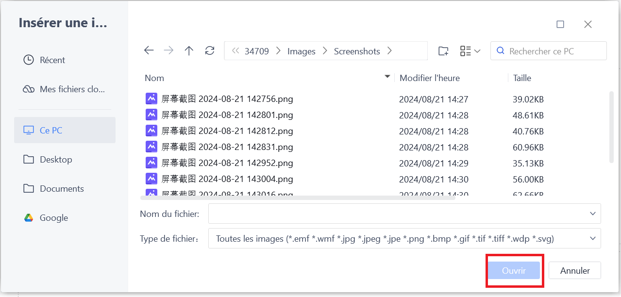 Parcourez les images que vous souhaitez insérer et cliquez sur "Ouvrir".