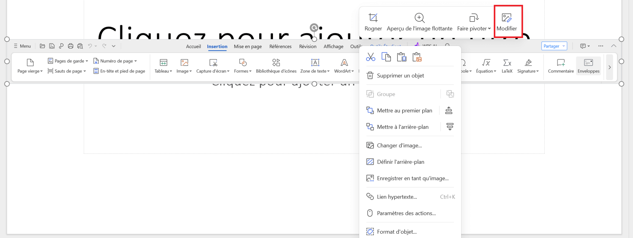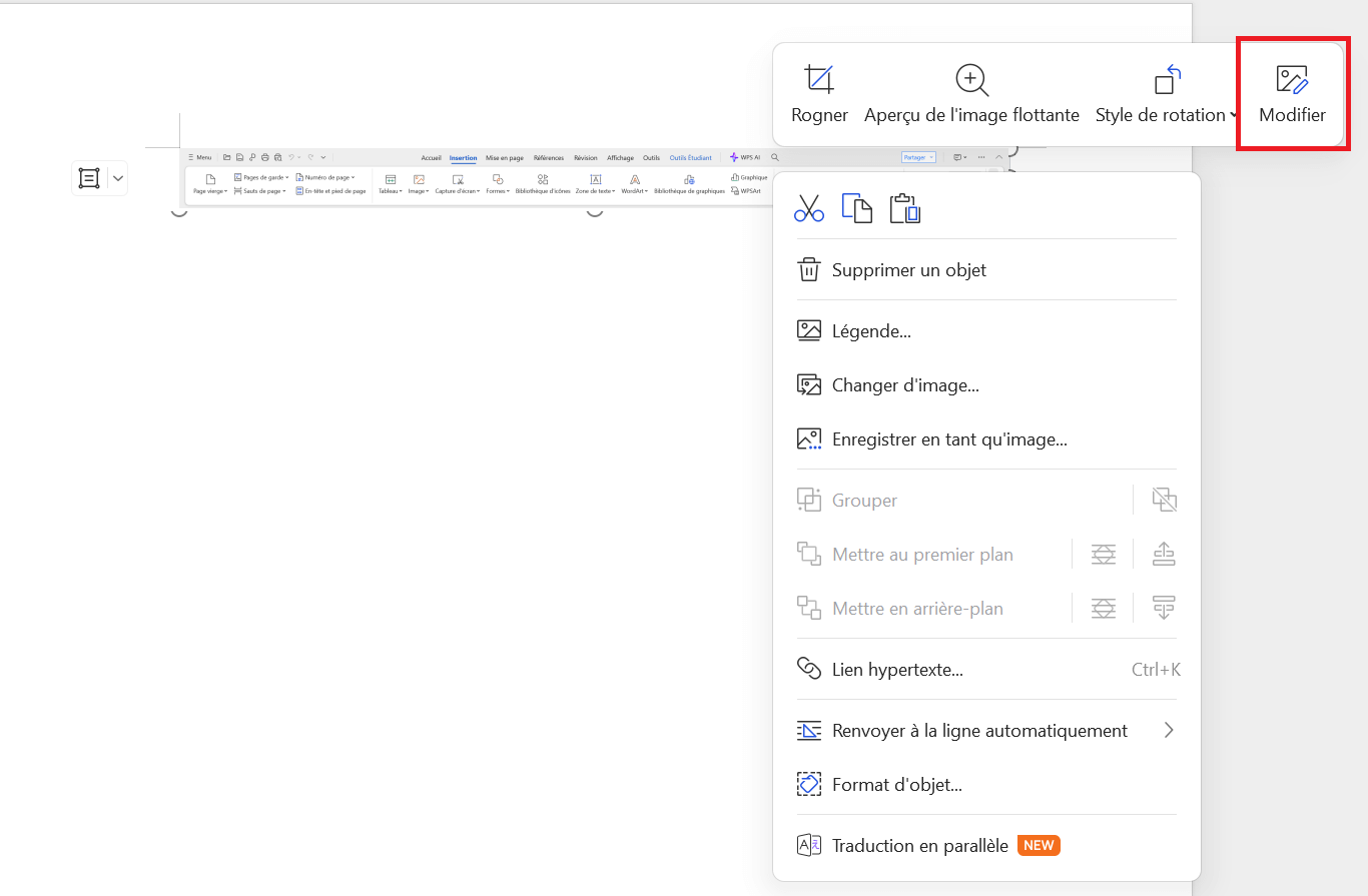 Cliquez avec le bouton droit sur l'image insérée pour ouvrir le menu contextuel.