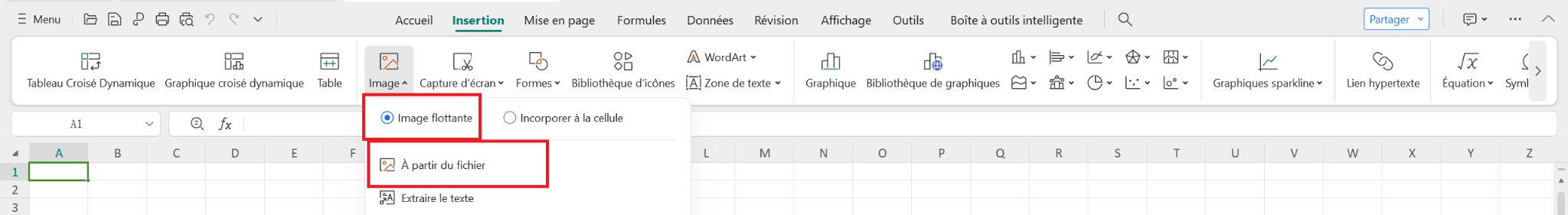 Sélectionnez l'endroit où vous souhaitez insérer l'image ; soit dans une cellule, soit en tant qu'image flottante, puis cliquez sur "À partir du fichier".