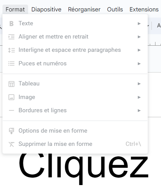 Étape 6 : Formatez vos diapositives : Appuyez sur le menu "Format" en haut à droite de l'écran pour formater vos diapositives.