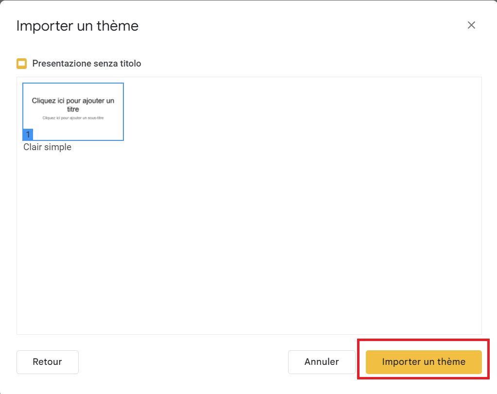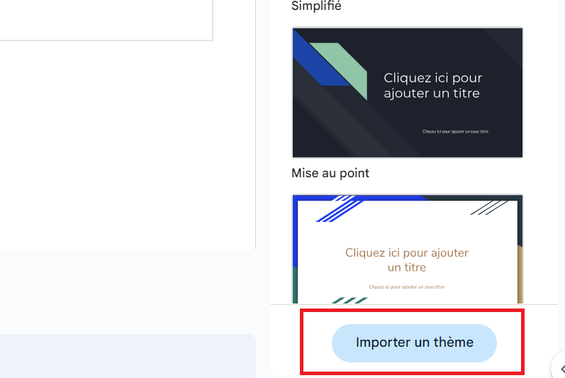 Étape 5 : Si vous souhaitez importer un thème d'une présentation précédente sur Google Slides, cliquez sur "Importer un thème".